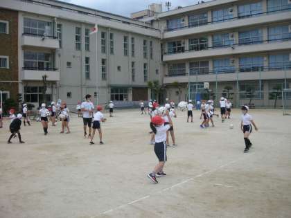 ボール遊びから始まり、クラス対抗戦、コーチとの対抗試合など、豊富な内容で、児童のみなさんも一生懸命に取り組んでいました。