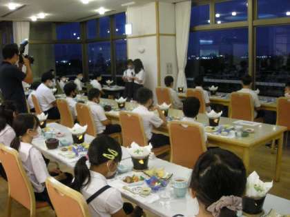 18:00、待ちに待った夕食です。豪華メニューに児童もうれしそうでした。食事係の「いただきます。」を合図に、「黙食」しながら、食事を楽しみました。