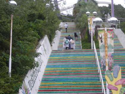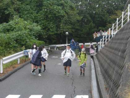 6年生がグループ活動を始めると、霧雨が上がりました。各グループは、お目当てのアトラクションの場所に、一斉に走って行きました。「鷲羽山ハイランド」は、山の中腹にありますが、みんな元気いっぱいです。