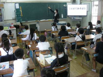 単元は、「ことばであそぼう」でした。かいぶん(回文)づくりやだじゃれづくりをしていました。1年生は、色々なアイデアを考え、発表していました。
