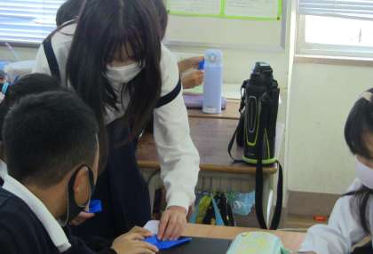 11月10日(木)、児童集会の時間を使って、6年生が1〜5年生の各教室に入り、平和への願いを込めた折り鶴づくりを教えました。(4年2組は、校外学習のため後日行います。)
