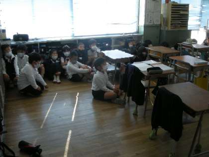 避難場所のカギの施錠、電気を消す、廊下側から離れ、静かに待つなど、全校児童がしっかりと避難行動をとることができていました。訓練終了後、先生の指示に従い、講堂へ移動しました。