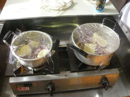 自分たちで苗を植え、収穫したさつまいもを蒸した後に、小さく切り、ホットプレートで焼きました。
