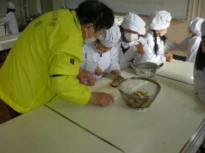 新型コロナウイルス感染症対策を講じ、1年生が11月18日(金)3・4限に、2年生が11月22日(火)2・3限に、愛育会のみなさんの支援のもと、焼きいも調理を行いました。