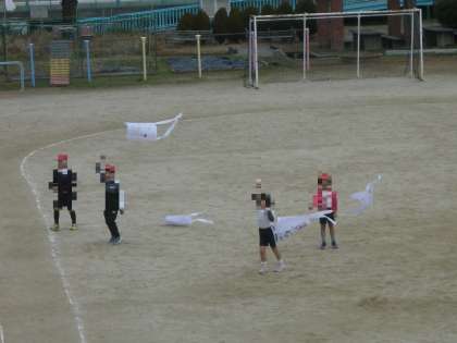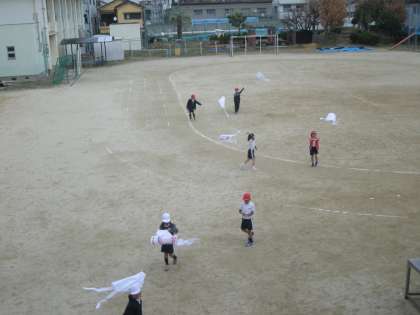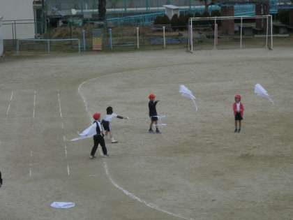 寒風の中、1年生が、図工の時間に作成した「凧」を運動場であげていました。