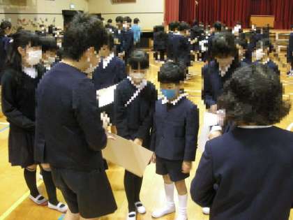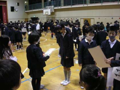 拍手に迎えられて入場した後、たてわり班に分かれて、1〜5年生が作成した「お祝いのメッセージ」を6年生に手渡しました。6年生のうれしそうな表情が印象的でした。