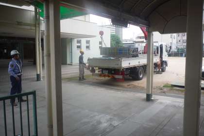 講堂の天井工事の作業用足場の組み立てが、今日から本格的に始まりました。工事期間は、10月末までの予定です。この期間は、警備員の方がお一人おられますが、工事車両の出入りや資材搬入等があり、危険ですので工事現場及びその周辺には絶対に近寄らないようにしましょう!