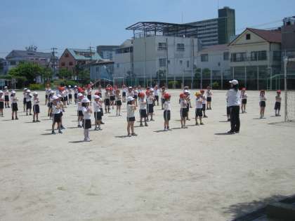 すばらしい晴天のもと、1年生全員が、整列をしての準備体操の後、「前にならえ」、「4列」、「2列」と隊形練習をしていました。たて、よこが徐々に揃ってきました。