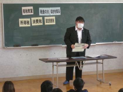 税金の種類や納税の大切さなどについて、講話やアニメーション動画でわかりやすく説明をしていただきました。6年生は、「税金」を身近に感じたようです。