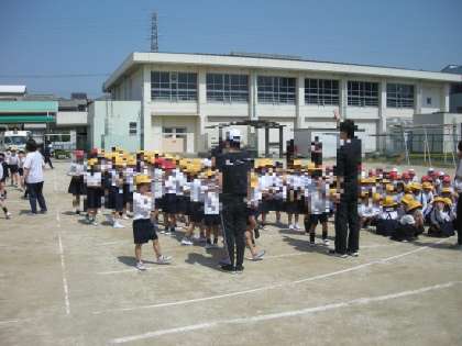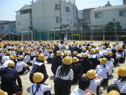 すべての児童が、真剣に訓練に取り組んでいました。校長先生からは、避難経路、避難集合場所、避難行動等についてお話がありました。