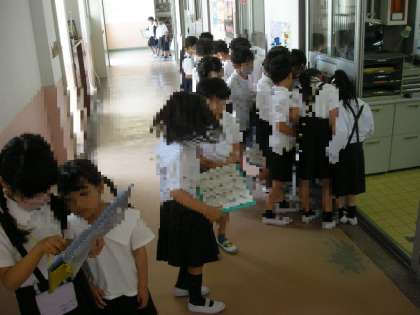 2年生のお兄さん、お姉さんが、学校には色々な教室があることをくわしく案内しました。仲よく行動することができました。
