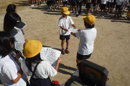 今朝の児童朝会で、図書委員会が読書チャンピオンの表彰を行いました。月の読書量によって、獲得級が上がっていきます。25冊で5級、50冊で4級というように25冊ずつで1級あがることになります。今日は、5〜4級が数十名、3級が数名、2級は1人という表彰でした。読書の秋を楽し診ましょう!