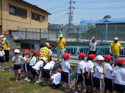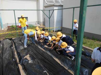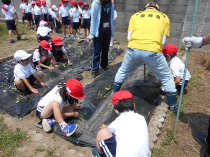 5月22日(月)、1・2年生が、愛育会のみなさんの指導のもと、さつまいもの苗を植えました。全員が、一生懸命に取り組んでいました。