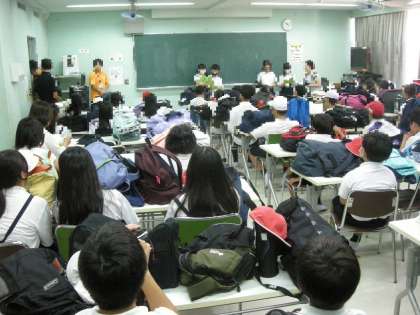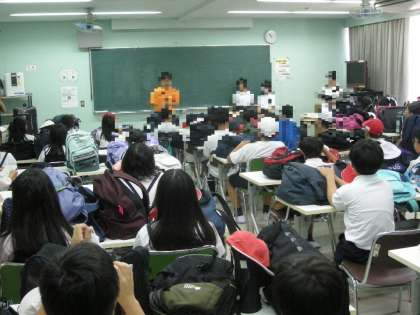 児童の司会進行のもと、代表児童あいさつの後、施設の方から、ふとんやシーツのしき方やたたみ方など、施設利用のオリエンテーションがありました。