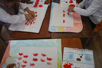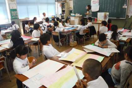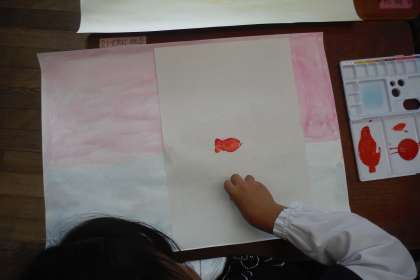 海を描いた画用紙に、スーパーで魚などを商品として店頭にならべるときに使用するトレイを魚の形に切って、それをペットボトルの蓋に付けたものに絵の具を付けてスタンプしていきました。