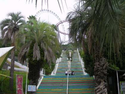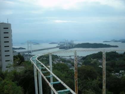 鷲羽山ハイランドは、山の中腹にあり、遠くには、「瀬戸大橋」を見ることができます。