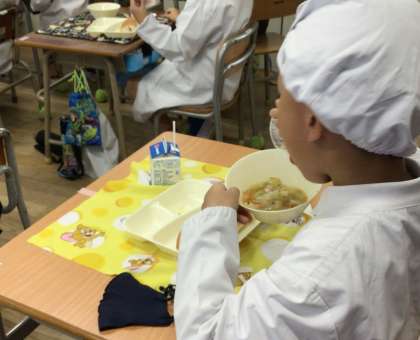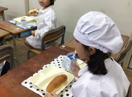 今日は、1年生の給食の様子を掲載します。カレー風味の効いた豚肉や、だしの効いたおいしいスープを、あっという間に平らげている子がたくさんいました。「ぼく、レーズン大好きやねん!」と、レーズンを噛みしめて食べている子もいました。