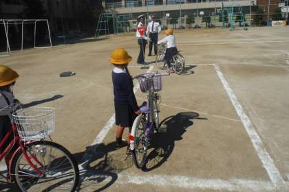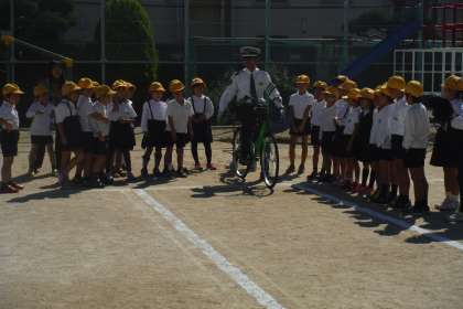 2年生を対象に、西淀川警察交通課の警察官お二人の方から、自転車乗車時の交通安全についての実技指導をしていただきました。