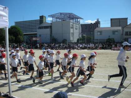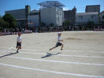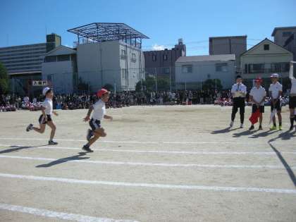 2年生は、やる気満々。全員が最後まで全力で走り切ることができました。白組が勝利しました。