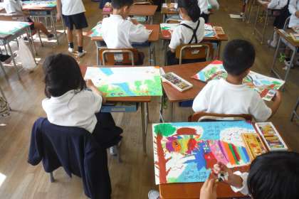 1年生が11月の作品展に向けて、恐竜の卵と恐竜の絵を制作していました。
