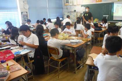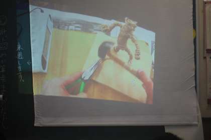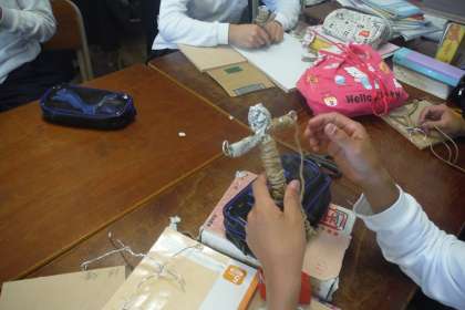 針金を芯に紐をまいて粘土をつけて人形にする作業をしています。