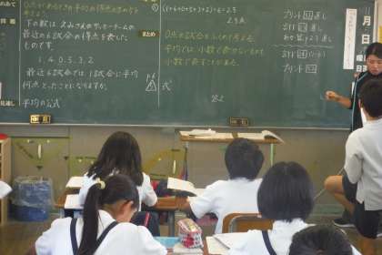 5年生算数科の授業で、習熟度別少人数指導で学年を3分割した各コースの様子です。子どもたちは、自分で選んだコースで授業を受けています。人数が少ないので、先生との距離も縮まり集中した学習の様子でした。