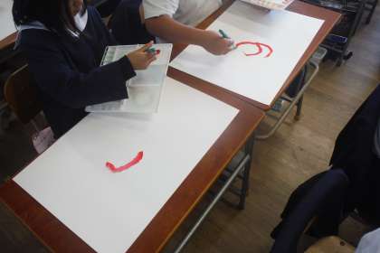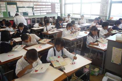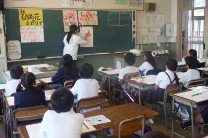 3年生は交換授業として、1組の担任が2組で図画工作科「ひがん花を描く」の指導をしているところです。子どもたちは、先生が見本で花びらをひとひら描くたびに、「エ〜 スゴイ!キレイ!」といって歓声をを上げていました。そして、いよいよ先生の言う通りに描いていくと、「自分も先生が描いた花びらが描けた」と、とても喜んでいました。