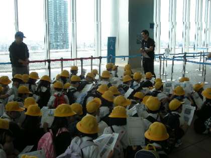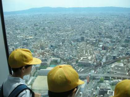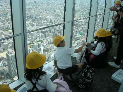 すばらしい快晴のもと、60階展望台から大阪市内を見学しました。グループで仲良く学習することができていました。