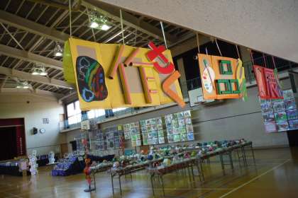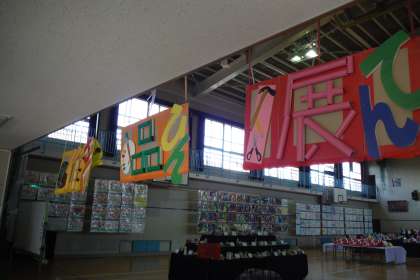本日から土お曜日まで、作品展を講堂で行っています。お時間があれば、ぜひお運びください。熱のこもった作品やかわいい作品等、子どもたち一人ひとりが一生懸命頑張った軌跡をぜひご覧ください。また、地域の福祉施設、生涯学習、本校PTAそれぞれの方々の作品も展示しています。あわせてご覧ください。