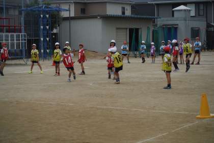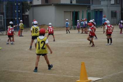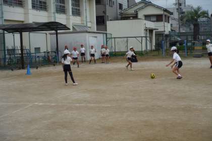 体育科の授業で、キックベースボールをしているところです。大きく蹴りだす子、小さくちょこと蹴りだす子、さまざまなキックが見られました。