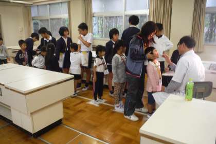 平成28年度、本校に入学予定の子どもたちを対象に、校医の先生方に健康診断をしていただきました。その際、本校の5・6年生がお手伝いをしてくれて、とてもスムーズに終えることができました。5・6年生の子どもたちは、就学前の子どもたちが不安がらないよう優しく健診場所まで案内してくれました。