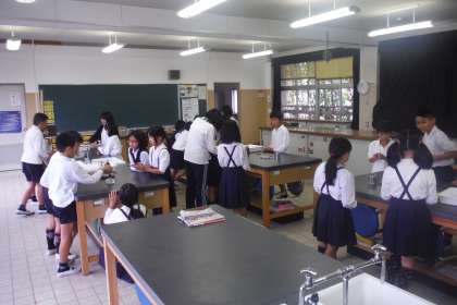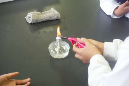 アルコールランプの使い方を学習しました。マッチと多目的ライターで火をつけて、蓋をして消火までを練習しました。