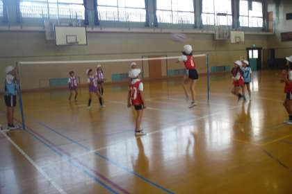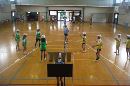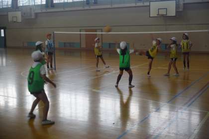 バレーボールのルールだとボールをつなげて相手チームに返すのが難しいので、ボールを持つチームが3回以内でボールを投げて自分のコート内で回します。そして、最後にスパイクをしても投げて相手コートに返してもOKというルールで、みんな楽しそうに頑張っていました。