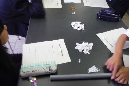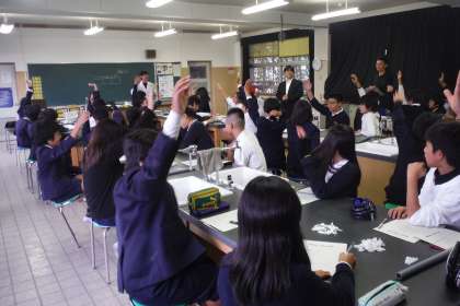 昨日は、淀中学校に行き中学校授業体験をさせていただきました。今日は、淀中学校の理科の先生お二人にき来ていただいて、理科の出前授業をいていただきました。授業は、「静電気実験〜静電気の不思議〜」という内容で行いました。その中で二つの実験を行いました。(1)塩ビパイプをティッシュでよくこすって静電気を起こし、ストロー・ティッシュ・アルミホイル・消しゴム・水・輪ゴムのどれが塩ビパイプにくっつくか?(2)アルミホイルをまいたコップを二つ重ねてライデン瓶をつくり、そこに電気を溜めていき、班員で手をつなぎ最初と最後の人がライデン瓶に触れる、という実験をしました。子どもたちは、実験に興味津々でとても良い学習体験ができました。昨日・本日の体験を生かして、中学校生活にスムーズに繋がっていってくれればと思います。ご多用のなか、お越しいただいた淀中学校の先生方に、厚くお礼申しあげます。ありがとうございました。