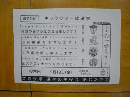 9月13日(金)(5年:3限、6年:2限)、西淀川区役所職員の方々をお招きし、5.6年出前授業(キャラクター総選挙)を実施しました。