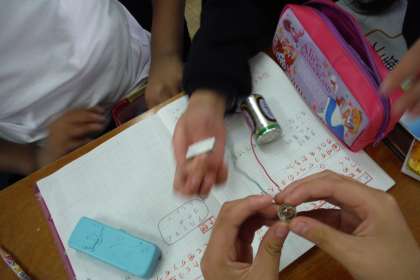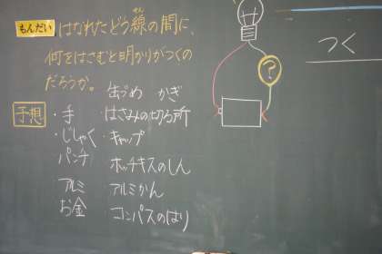 「はなれたどう線の間に、なにをはさむと明かりが点くのだろう」で、手・磁石・アルミ缶などを挟んで、豆電球が点灯するかを試しました。