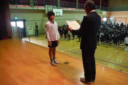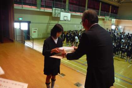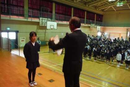 西淀川税務署から、「税の習字」で表彰された3人です。3人とても嬉しそうで、みんなから祝福の拍手が送られました。