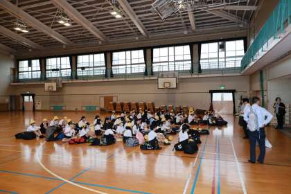 激しい雨の中、6年生全員が、時間どおりに集合することができました。