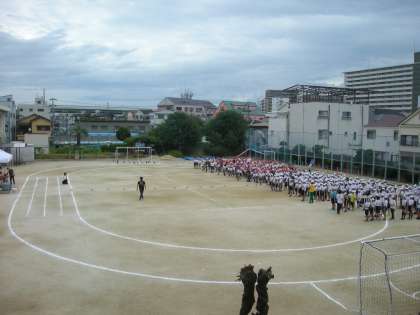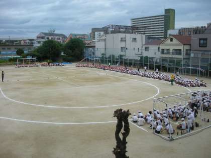 児童席から、運動委員を先頭に全員が整列して、児童入場、開会の言葉、開会式の練習です。