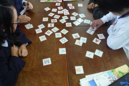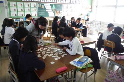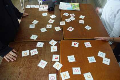 A〜Zまでの大文字小文字のカードを並べて、C−NETの先生がA〜Zで始まる単語を言われ、そのカードいち早く取り合うゲームを楽しんでいました。