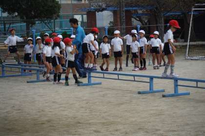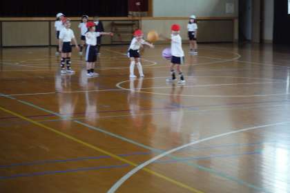 1組(運動場)と2組(講堂)の体育科の学習の様子です。