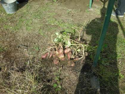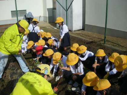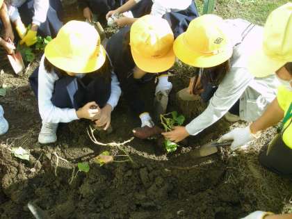 11月5日(火)1限、愛育会のみなさんの指導のもと、1年生は、いもほりをしました。いもの苗から学習園で育てた「さつまいも」をみんなで収穫しました。大きなさつまいもを掘り当てると大きな歓声が上がっていました。