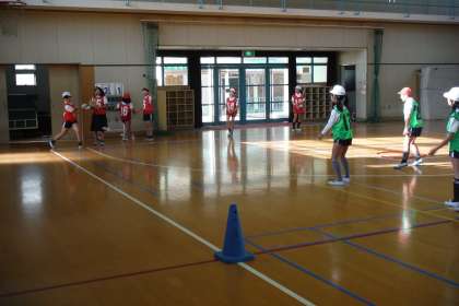 講堂では、ティーボールを行っていました。道具として、ラケットを使ってボールを打っていました。それぞれのチームで作戦を立て、守備位置などを工夫して守っていました。