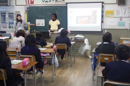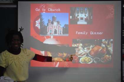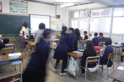 2学期最後のC−NETの先生の授業です。授業前半は、英語の歌を聴きながら、先生が指定した単語が歌われた時に、席を移るゲーム。授業後半は、アメリカのクリスマスの様子を聴いて、終わりはおはじきを運ぶゲームで結構盛り上がりました。