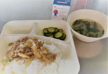 今日の給食はビリ辛丼の辛味成分で体をポカポカ温め、さっぱりとしたきゅうりの甘酢づけで疲労回復に効果がある組み合わせでした。
