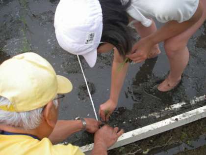 イネの持ち方・植え方を教えてもらいました。そして、はだしになり、田んぼの中へ。「きゃーきゃー」「わーわー」いいながら、植えていきました。秋の「おにぎりパーティー」を楽しみに。