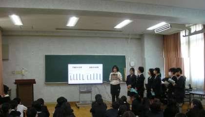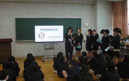 学校保健委員会では、保健委員会より、感染症に負けない体づくりをめざした1年間の活動のまとめと感染症予防について発表がありました。クイズを交え、内容もわかりやすく、しっかりと発表することができました。よくがんばりました。
