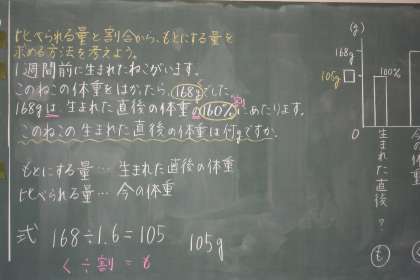 「比べられる量と割合からもとになる量を求める方法」の学習をしました。家での復習がとても大切です。本日中にしておきましょう。