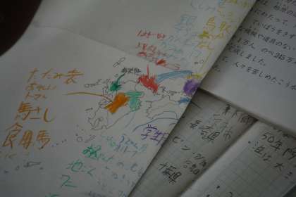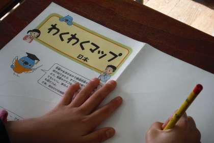 今日は、テレビをみながら山口県の様子を知り、秋芳洞や河豚など有名な場所や食べ物を、わくわくマップに書き込んでいきました。