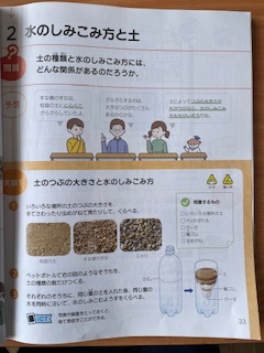 水のしみ込み方と土の学習をしました。土の種類と水のしみ込み方にはどんな関係があるかを考えるました。